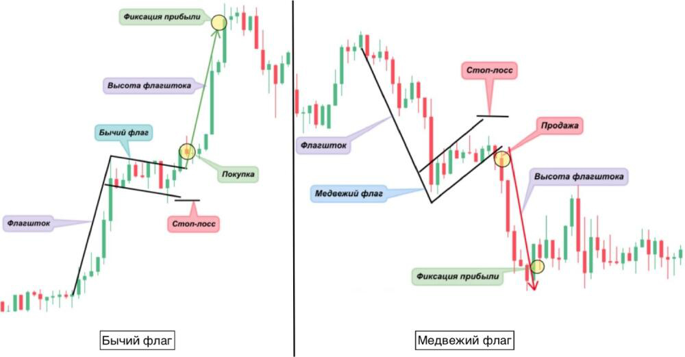 Паттерн «флаг» является паттерном продолжения тренда и существует двух видов: бычий и медвежий.