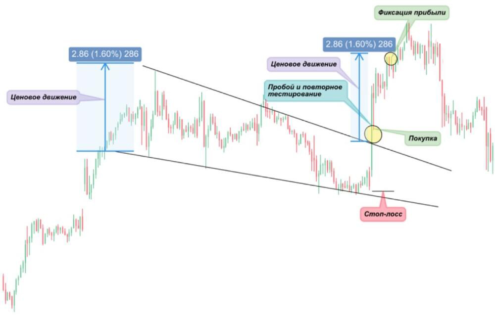 На картинке видно, что цена плавно снижалась после основного бычьего тренда, сокращая при этом минимумы и максимумы цены. После сужения торгового канала произошел импульсный пробой котировок вверх. Дождавшись повторного тестирования пробитого уровня сопротивления, можно было открывать сделку на покупку с целью выше на уровень высоты падающего клина. Стоп-лосс в таком случае необходимо устанавливать на нижней границе торгового канала.