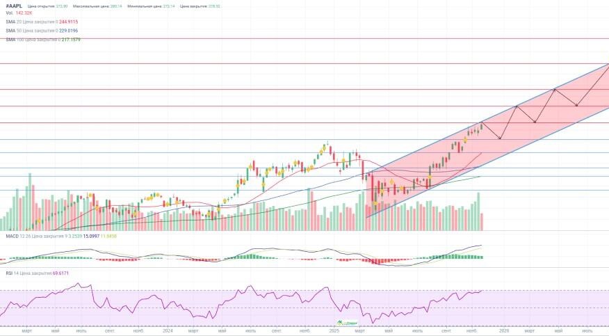 Акции Apple торгуются в устойчивом восходящем тренде, цена регулярно обновляет локальные максимумы. Нижняя граница канала сейчас проходит в области $250-255. Котировки расположены выше SMA 20, 50 и 100, то есть выше уровней поддержек $245, $230 и $217.