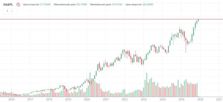 Во второй половине 2025 года акции AAPL показали уверенный рост и достигли исторического максимума $284,00 к концу ноября.