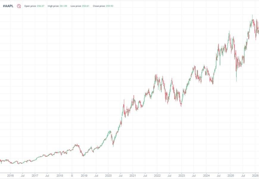Американская корпорация Apple — один из крупнейших мировых разработчиков техники, цифровых услуг и программного обеспечения. Акции компании традиционно популярны среди инвесторов за счет стабильных финансовых показателей, постоянных инноваций и лояльной аудитории.
