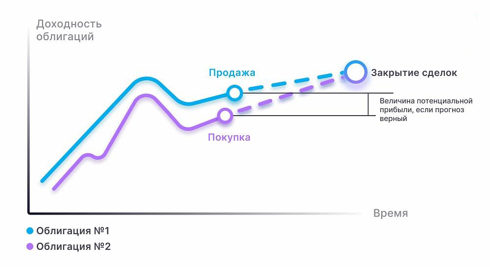 Предположим доходность облигации №1 составляет 4%, а облигации №2 — 3,5%. Также эмитенты бумаг действуют в рамках одной отрасли, имеют схожую логистику и примерно одинаковую прибыль. Следовательно, арбитражный трейдер может предположить, что фактическая доходность в будущем у обеих бумаг будет одинаковой. Тогда он открывает длинную позицию по облигации №2 (с доходностью 3,5%) и короткую — по облигации №1 (с доходностью 4%). Если цена облигаций совпадет, трейдер получит прибыль в размере 4 – 3,5 = 0,5%.