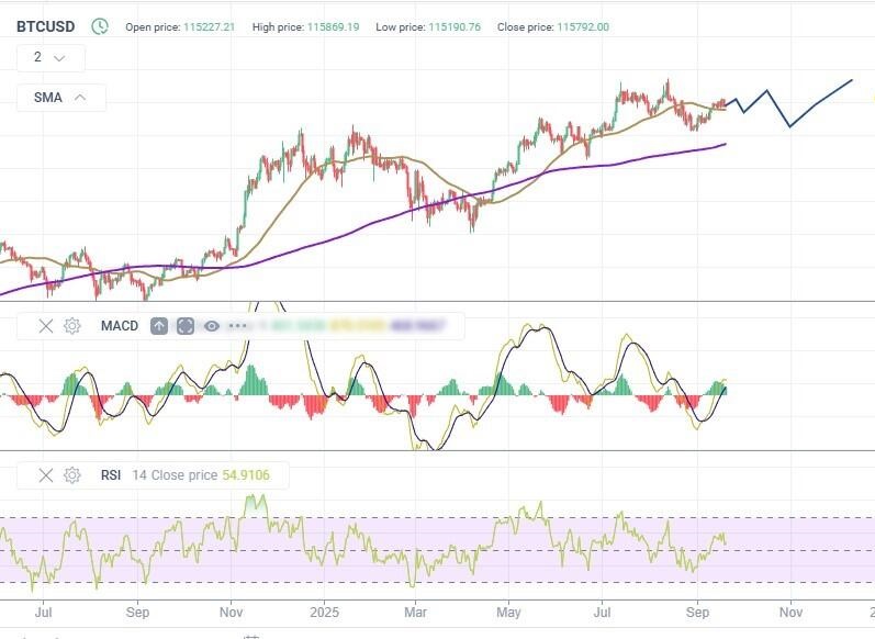 В настоящее время цена биткоина остается выше долгосрочной поддержки в районе скользящей средней SMA200 на 103 200.00 и удерживает позиции над SMA50 около 114 200.00, что указывает на сохранение бычьего настроя на рынке. После снижения в августе 2025 года цена перешла в фазу консолидации и стабилизировалась ниже отметки 117 300.00.