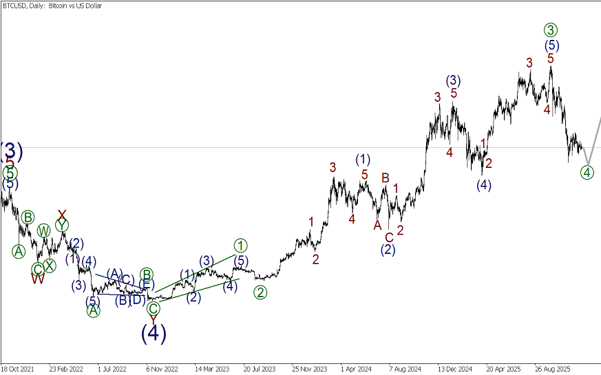 Завершена импульсная волна [3]. Сейчас в стадии развития медвежья волна [4], она принимает форму тройного зигзага (W)-(X)-(Y)-(XX)-(Z). Предположительно, первые четыре части данной фигуры завершены, либо достраивается конечный участок треугольной коррекции (XX). В течении ближайшей недели ожидается снижение в волне (Z) к предыдущему минимуму 80770.57. Данный уровень ранее отметила волна (Y).