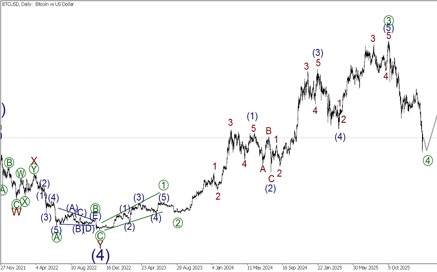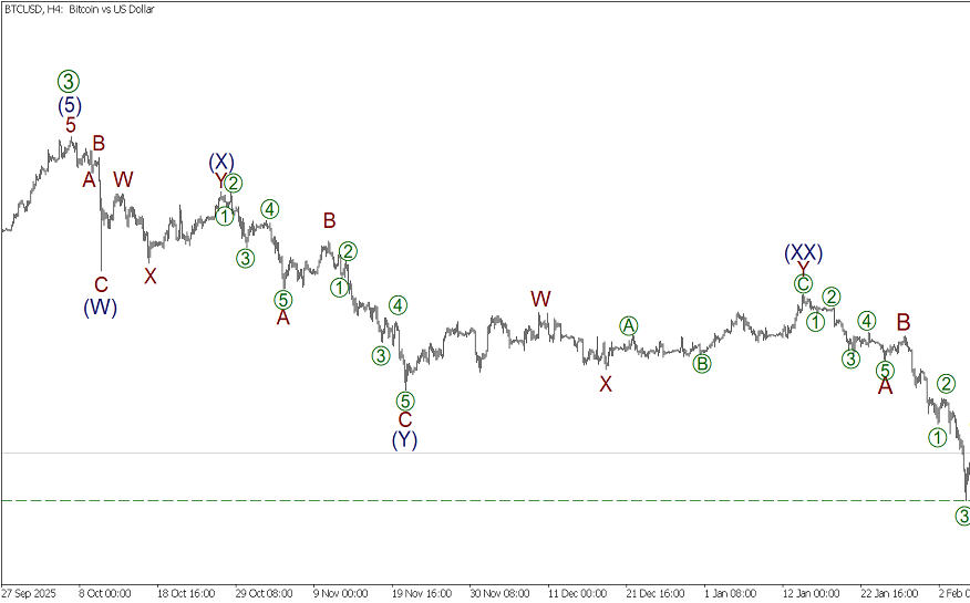 Завершена импульсная волна [3]. Сейчас в стадии развития медвежья волна [4], она принимает форму тройного зигзага (W)-(X)-(Y)-(XX)-(Z). Недавно завершилась последняя часть сложной коррекции (XX) в виде двойного зигзага. В течении ближайшей недели ожидается снижение в волне (Z), точнее в ее финальной импульсной подволне C, в направлении 60736.28. На данном уровне ранее была завершена подволна [3].