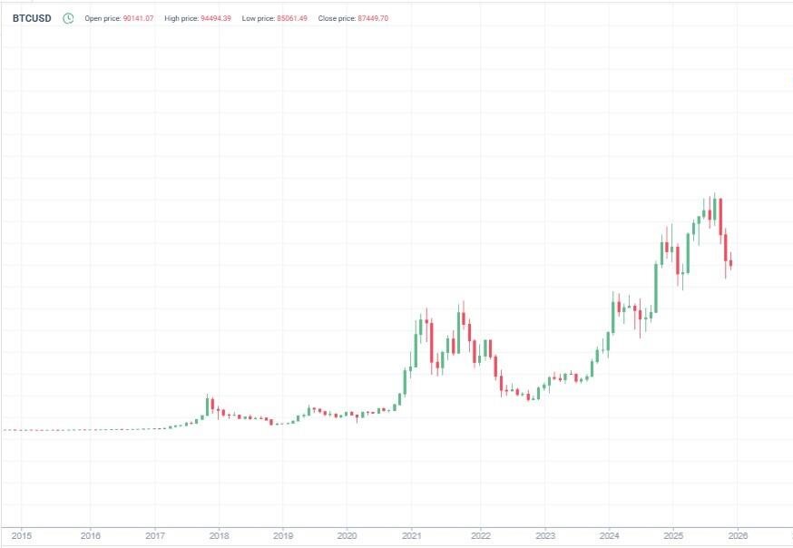 6. 2025. Обновление исторических максимумов – цена превысила отметку $120000. После этого началась коррекция, к концу ноября котировки упали до $85000.
