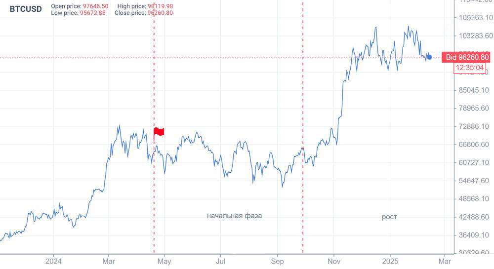 После халвинга биткоина 20 апреля 2024 года, когда вознаграждение за блок уменьшилось до 3.125 BTC, началась фаза накопления или, как ее еще называют, «начальная фаза». Она длилась шесть месяцев, до октября 2024 года, после чего на рынке случился кратковременный Bull Run. С октября по декабрь 2024 года цена биткоина выросла с $65 000 до $101 000, прибавив около 50% стоимости.
