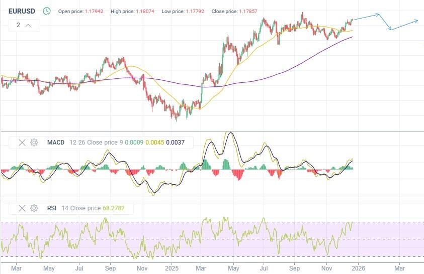 Индикатор RSI находится в верхней части диапазона, указывая на сильный импульс и возможное краткосрочное ослабление тренда. MACD выше нулевой линии и развивается волнообразно, чередуя фазы ускорения и стабилизации. Согласно техническому анализу, после завершения коррекции цена способна вернуться к росту, постепенно смещаясь в сторону 1.18–1.20. Поддержка, вероятно, будет формироваться в области 1.15.