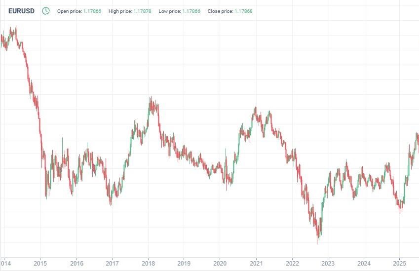 Чтобы сделать наши прогнозы максимально точными, важно оценить исторические данные. Ниже представлен график EURUSD за последние десять лет.