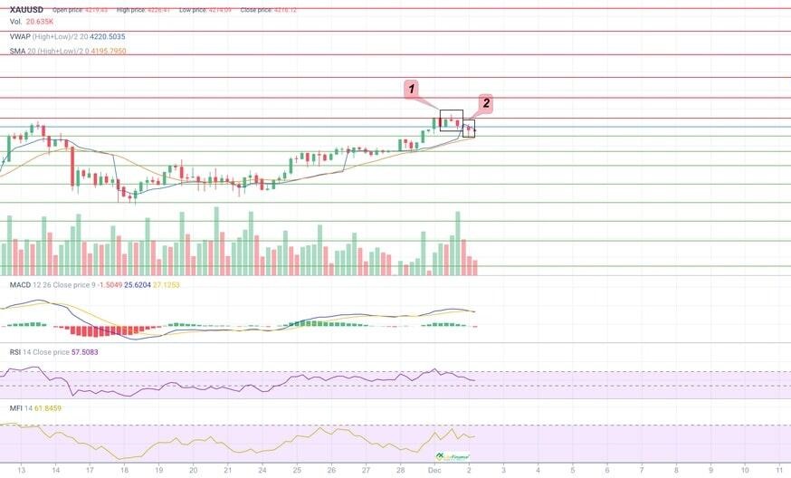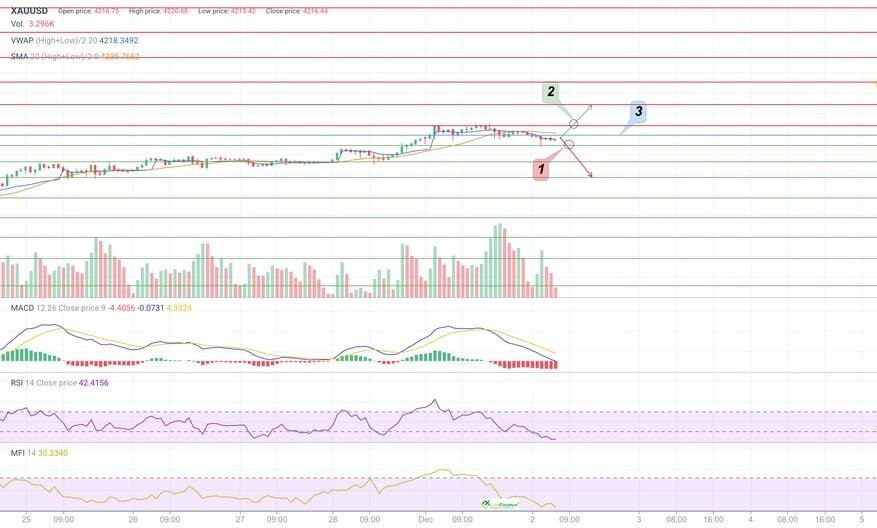 К 3 декабря 2025 года прогнозируется, что цена XAUUSD может развернуться и пойти вниз.