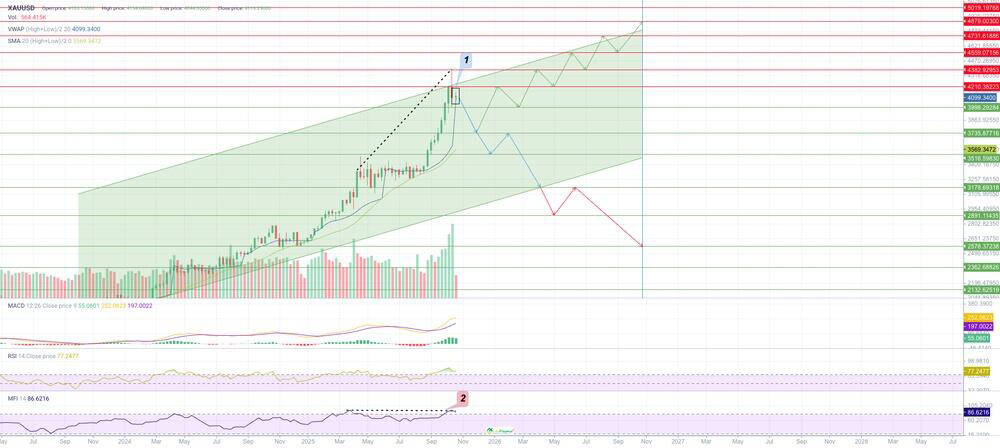 С середины октября 2025 года цена ушла в коррекцию после обновления исторического максимума $4381,24. Технические индикаторы и паттерны свечного анализа указывают на перекупленность актива, возможно снижение в краткосрочной перспективе.
