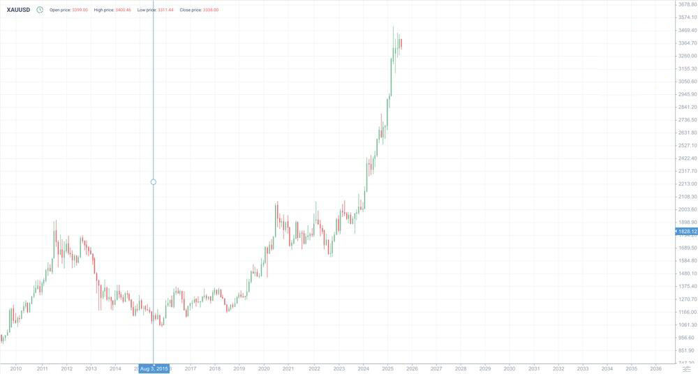Ниже представлен график XAUUSD за последние десять лет. Чтобы сделать наши прогнозы максимально точными, важно оценить исторические данные.