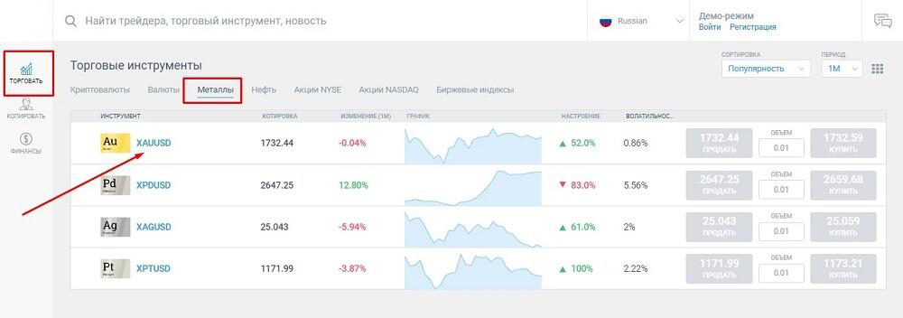 3. Откройте терминал и во вкладке «Металлы» выберите пару XAU/USD.