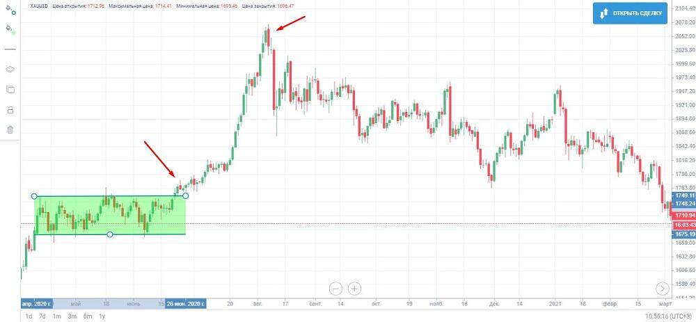 Пример. После небольшого бычьего тренда сформировалась зона консолидации, выделенная горизонтальным каналом.