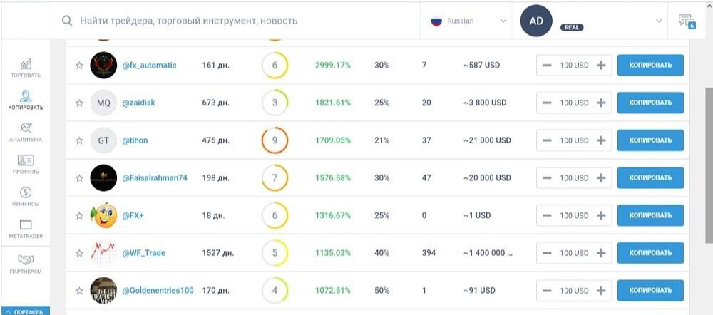 СОВЕТ: вы можете начать копировать сделки опытных трейдеров на свой счет. Выберите трейдера из списка, пополните свой счет и запустите копирование.