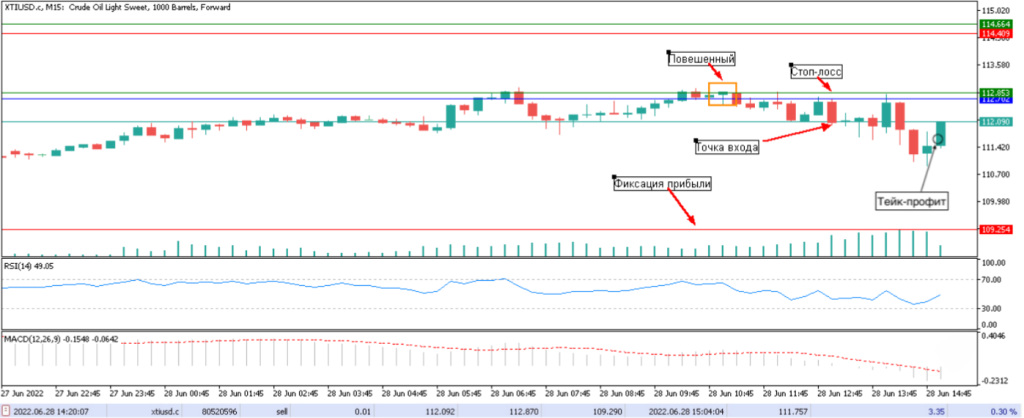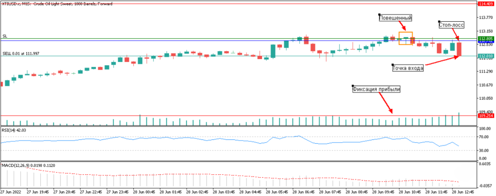 Вторая сделка была осуществлена по инструменту USCRUDE. После восходящего тренда на 15-ти минутном графике сформировалась фигура «повешенный», что послужило сигналом на открытие короткой позиции на 0.01 лот.