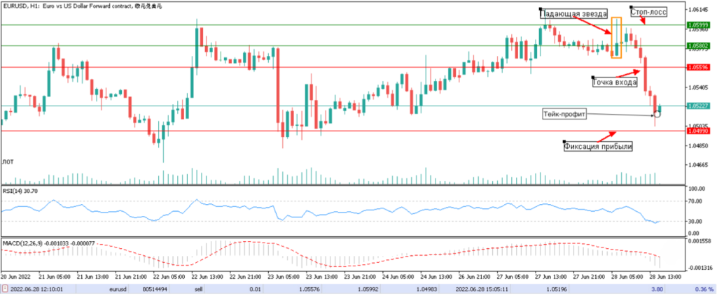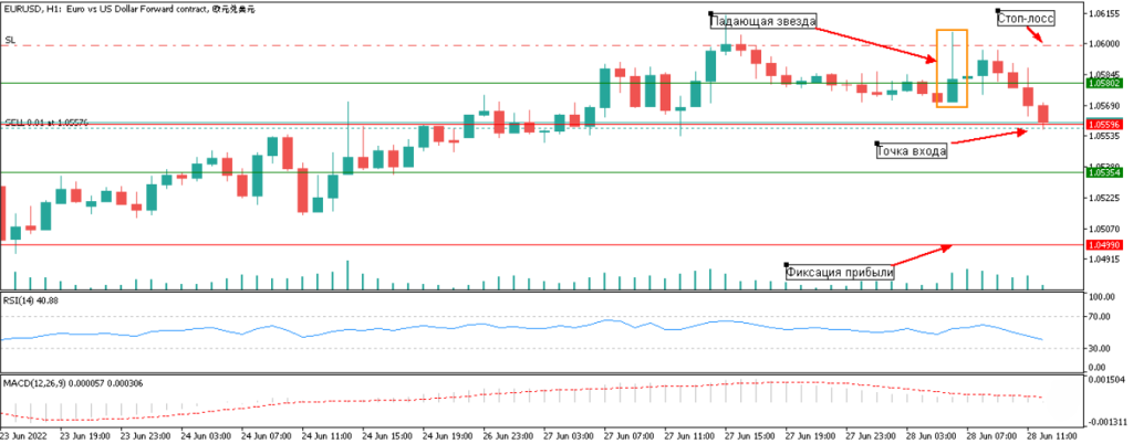 На часовом графике EURUSD ниже видно образование паттерна «падающая звезда», который предупреждал трейдеров о надвигающемся снижении котировок.