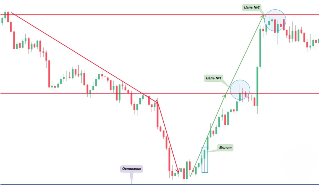 Важно также понимать, что модель является сильным сигналом и при ее появлении, с большей вероятностью, можно ожидать смену тренда. Поэтому построение «молота» является хорошим поводом для открытия длинных позиций.