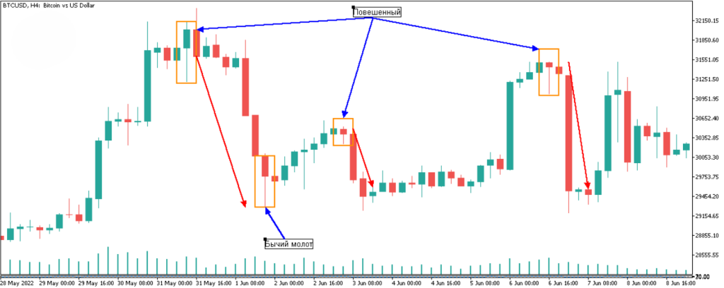 Ниже разберем паттерн «повешенный» на четырехчасовом графике BTCUSD. На картинке видно, что после появления паттерна «повешенный» на каждой из локальных вершин, инструмент снижался и в некоторых местах достаточно активно. Каждая модель, которая появилась на графике, предупреждала трейдеров о том, что тренд завершается и пройти выше мешает сопротивления медведей. Следовательно, в этих случаях важно выходить из сделки на покупку и дожидаться подтверждения разворота.