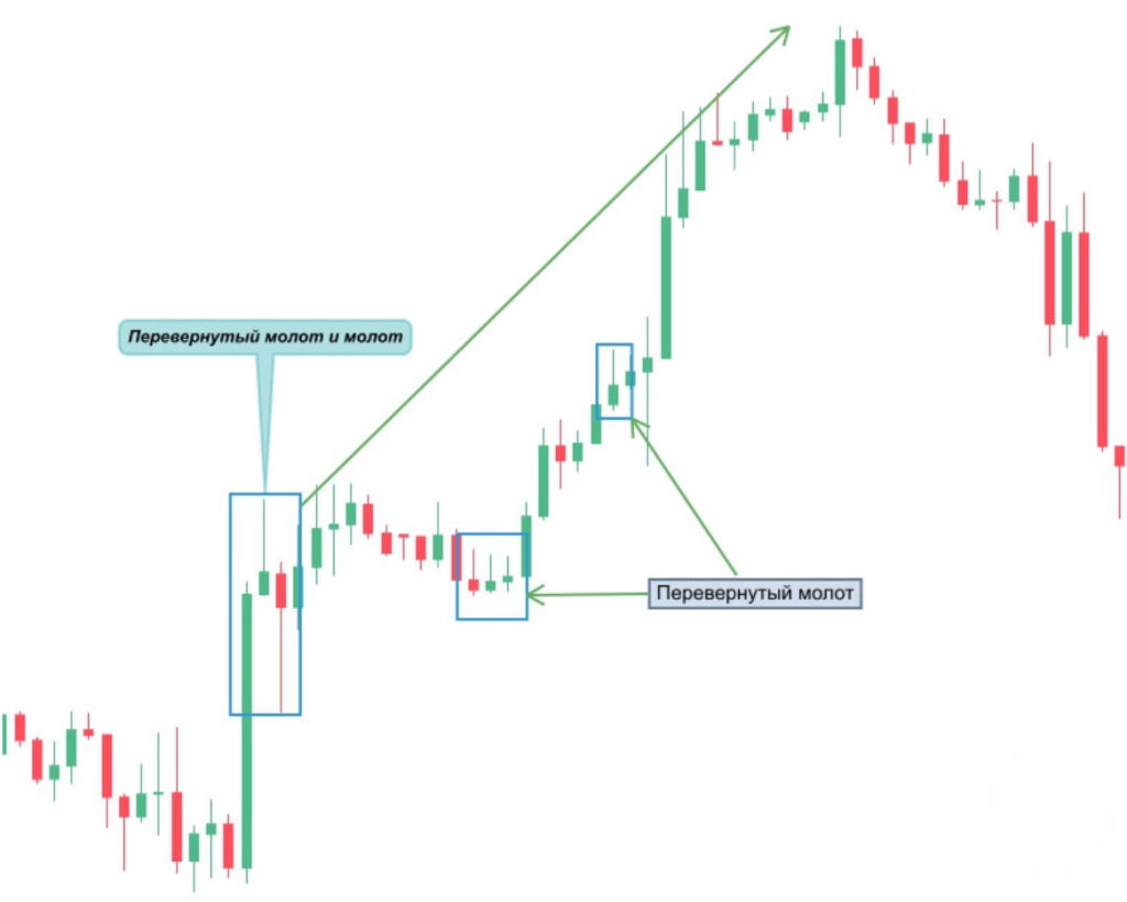 Зеленый «бычий молот» больше подчеркивает нарастание покупок и восходящую тенденцию на рынке.