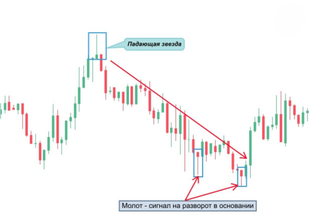 - «Перевернутый молот» — разворотная свеча с малым телом внизу и длинной верхней тенью; бычий в основании («перевернутый молот»), медвежий на вершине («падающая звезда»).