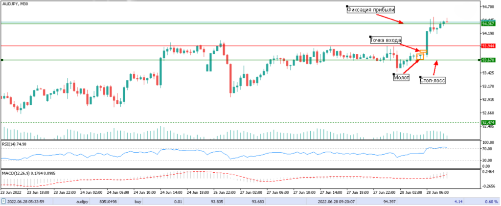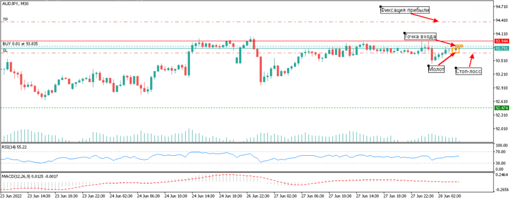 Для отработки сигнала по паттерну «молот» я использовал 30-минутный график валютной пары AUDJPY.