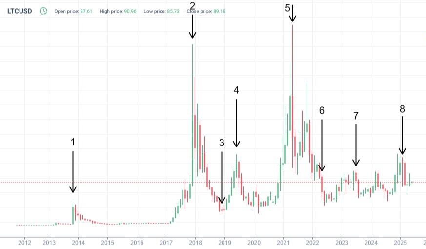С момента запуска в 2011 году цена Litecoin прошла несколько значительных циклов роста и падения.