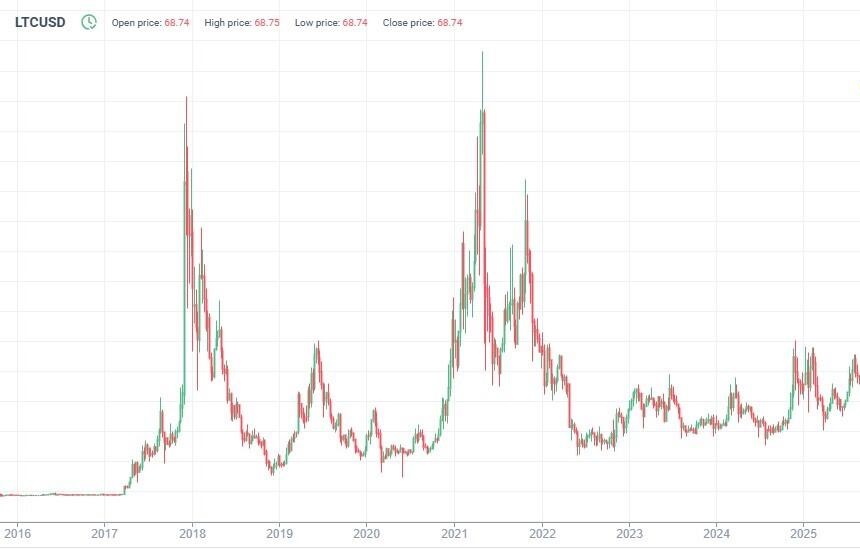 Ниже представлен график LTCUSD за последние десять лет. Чтобы сделать наши прогнозы максимально точными, важно оценить исторические данные.