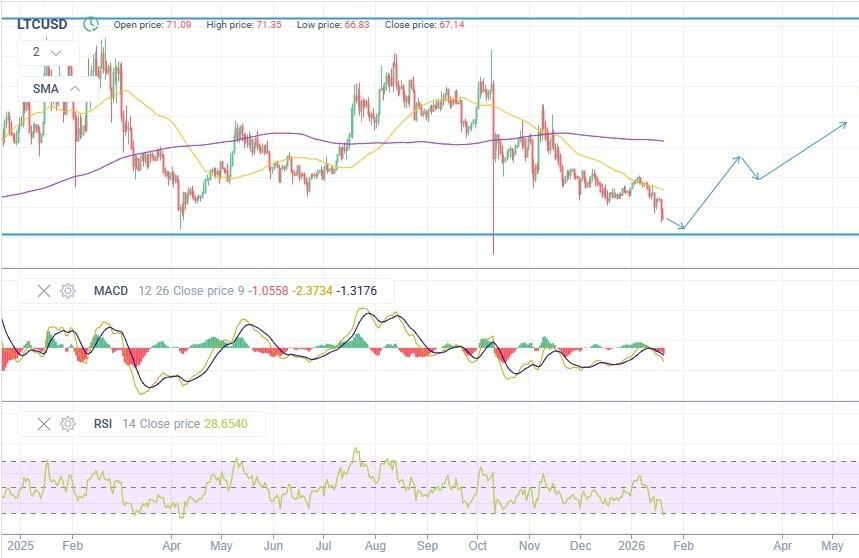 - В начале 2026 года LTC торгуется ниже 50 и 200-дневных SMA. Цена удерживается у поддержки $68–72, есть слабые сигналы на восстановление.
