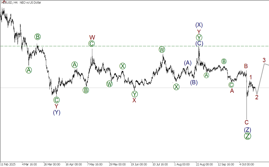 В долгосрочной перспективе по NEOUSD строится глобальный коррекционный тренд в виде медвежьего тройного зигзага [W]-[X]-[Y]-[X]-[Z]. Завершена действующая волна [Y] в качестве зигзага (A)-(B)-(C). Также, предположительно, завершилась вторая волна-связка [X] в виде тройного зигзага (W)-(X)-(Y)-(X)-(Z). Высока вероятность, что финальная медвежья волна [Z] тоже сформирована. Рассмотрим график на H4.