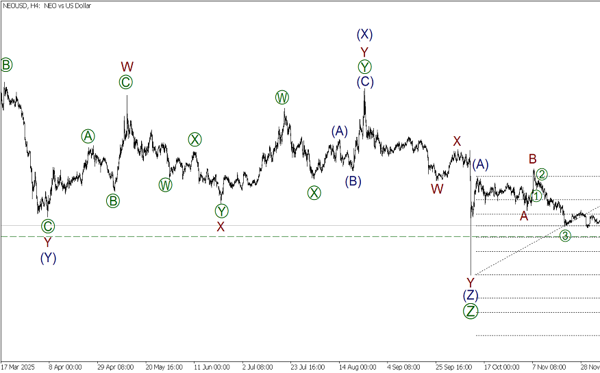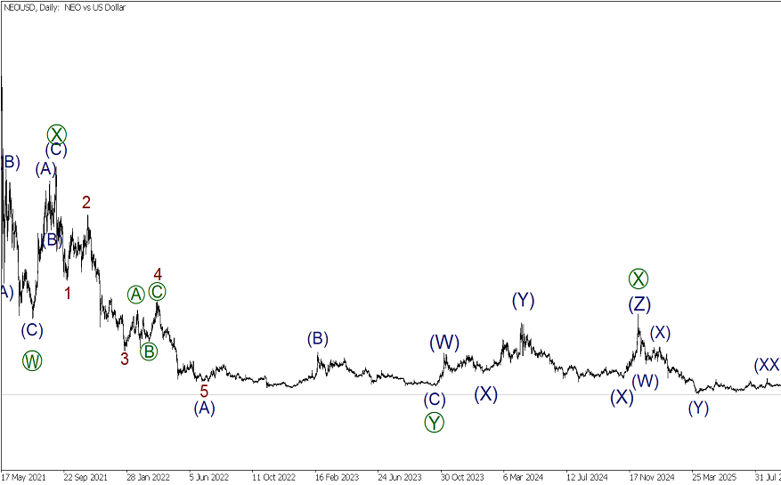 На дневном графике NEOUSD представлена разметка крупного коррекционного тренда – формируется тройной зигзаг [W]-[X]-[Y]-[X]-[Z]. Предположительно, на текущий момент он полностью сформирован. На последнем участке графика строится начальная часть нового восходящего тренда. В стадии развития действующая волна [W].