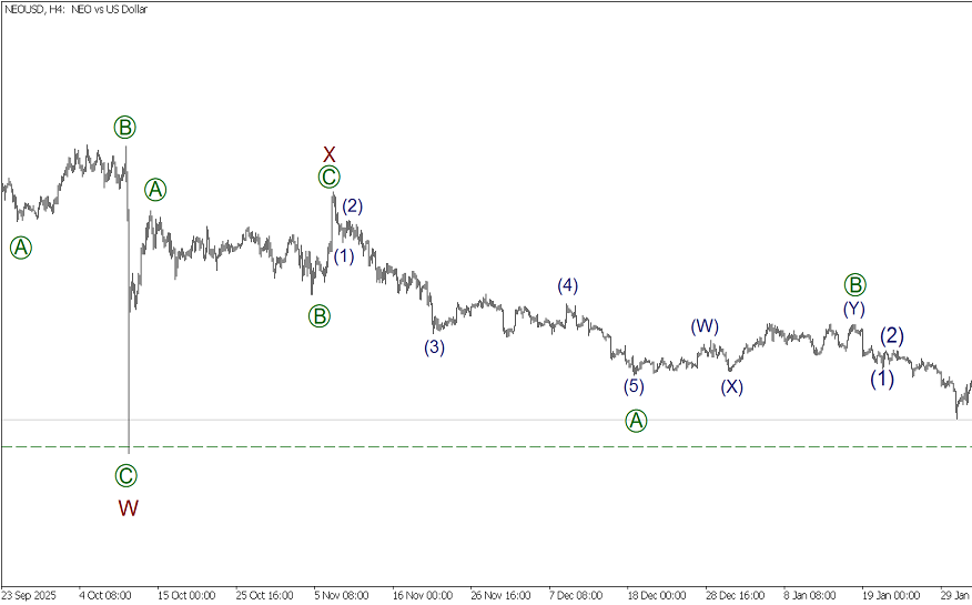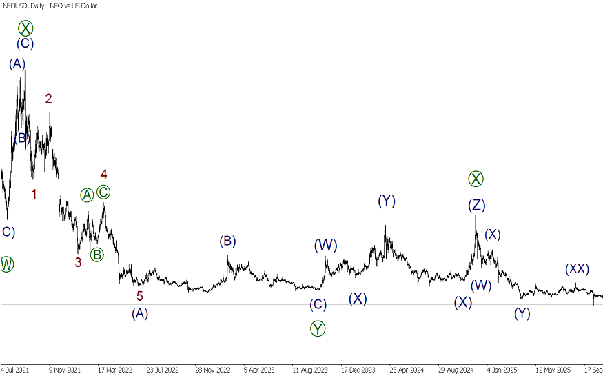 На дневном графике NEOUSD представлена разметка крупного коррекционного тренда. Предположительно, формируется тройной зигзаг [W]-[X]-[Y]-[X]-[Z]. Первые четыре части данной конструкции полностью завершены. В стадии развития последняя действующая волна [Z], она тоже похожа на тройной зигзаг (W)-(X)-(Y)-(XX)-(Z) меньшего волнового уровня.