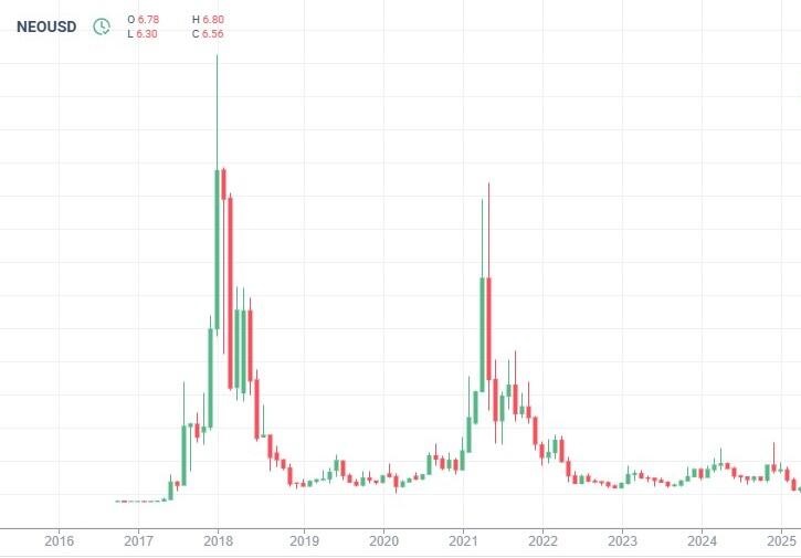 NEO прошел через несколько ценовых циклов с момента своего запуска. В 2017 году стоимость актива резко выросла с $0.20 до $196 на пике криптовалютного буллрана, что было вызвано ажиотажем вокруг ICO и активным принятием блокчейн-платформы в Китае.