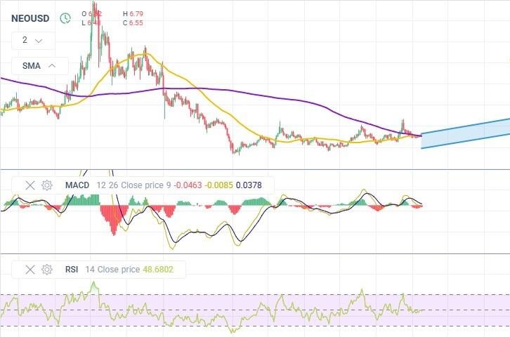 Технические индикаторы показывают нейтральную картину. RSI держится около 49, это сигнализирует о балансе между спросом и предложением. MACD около нулевой линии, сильного импульса нет. Пока актив торгуется выше $6,2, стоит рассматривать покупки. При благоприятных рыночных условиях ближе к концу года курс NEO может вырасти до $9,4, однако возможны небольшие откаты.