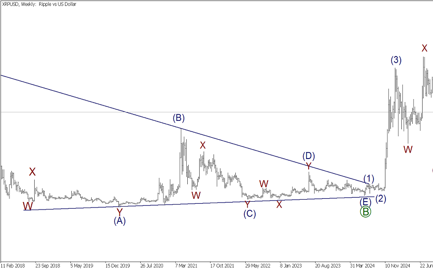 В долгосрочной перспективе по XRPUSD формируется глобальный бычий тренд в виде стандартного зигзага [A]-[B]-[C]. Завершилась импульсная волна [A] и коррекция [B] в виде сходящегося треугольника (A)-(B)-(C)-(D)-(E). Цена растет в импульсе [C], который размечен подволнами (1)-(2)-(3)-(4)-(5).