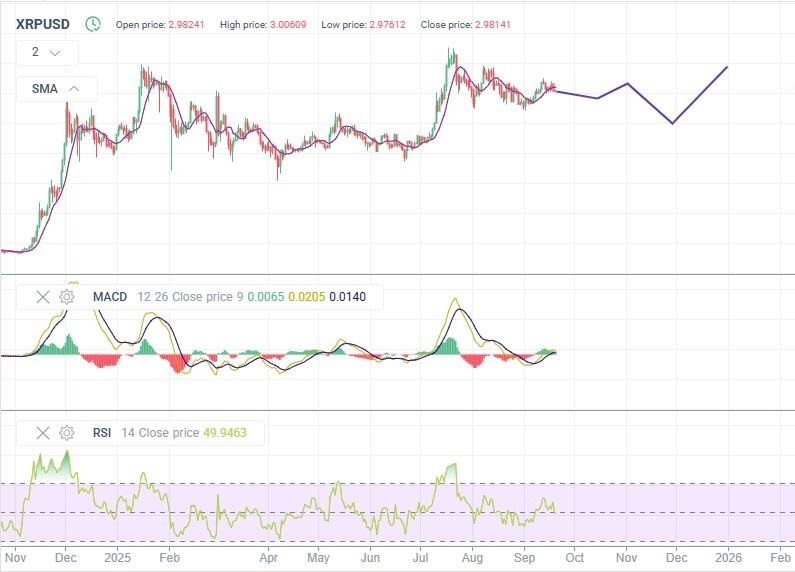 XRP после роста летом 2025 года закрепился на уровне $3. Сейчас цена расположена около скользящих средних. Пока цена держится выше долгосрочной SMA, актуальны длинные позиции.