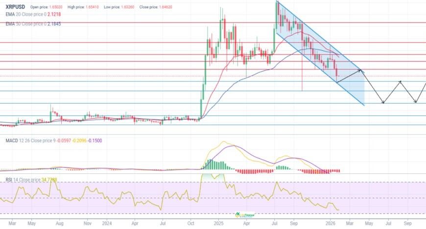 В первой половине 2026 года актуальны продажи, пока цена остается ниже EMA 20 и EMA 50 и удерживается в нисходящем канале. Основной сценарий: снижение к $1,51 и тест $1,27, на этом уровне возможен разворот.