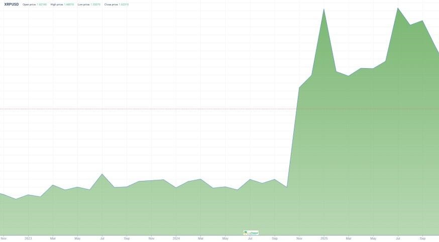 7. В августе 2025 года Комиссия по ценным бумагам и биржам США (SEC) и Ripple достигли соглашения об отказе от подачи апелляций, тем самым многолетний судебный спор был завершен. На этом фоне цена выросла за несколько дней более чем на 23% до $3,38. Однако к концу декабря курс снизился до $1,87.