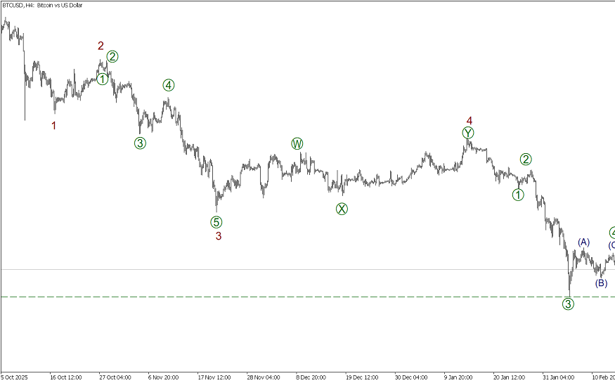 Предполагается, что по Биткоину формируется медвежья импульсная волна (A), которая состоит из подволн 1-2-3-4-5. Завершены первые четыре части, сейчас строится финальная подволна 5 в виде импульса [1]-[2]-[3]-[4]-[5]. Возможно, завершилась коррекция [4] в форме зигзага (A)-(B)-(C). В ближайшее время ожидается снижение в подволне [5] к минимуму 60622.63, который отметила подволна [3].