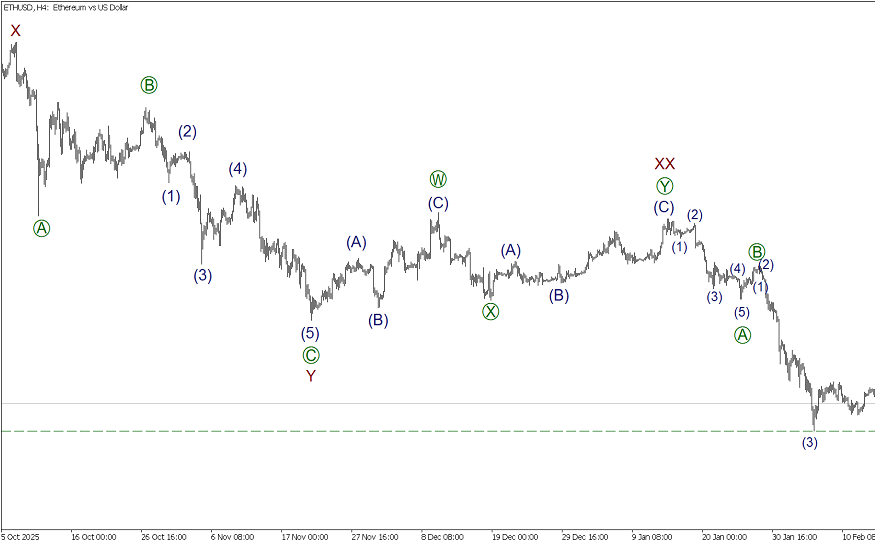 По ETHUSD формируется крупный восходящий зигзаг (A)-(B)-(C). Завершена первая импульсная волна (A). Сейчас, предположительно, строится коррекция (B) в виде тройного зигзага W-X-Y-XX-Z. Сформированы действующая волна Y и боковая волна-связка XX в виде двойной тройки. В ближайшее время ожидается снижение в финальной действующей волне Z к уровню 1772.19. Данный минимум ранее отметила импульсная подволна (3).