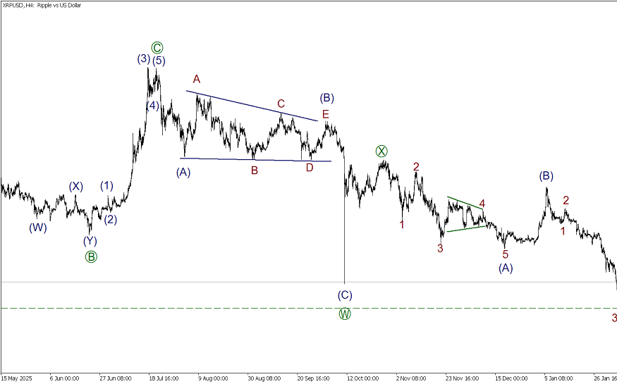 По XRPUSD в глобальной перспективе формируется бычий импульс (1)-(2)-(3)-(4)-(5). На текущем графике представлена коррекция (4), она принимает форму двойного зигзага W-X-Y. В процессе развития действующая волна Y, она тоже похожа на двойной зигзаг [W]-[X]-[Y]. Внутри заключительной действующей волны [Y] завершены импульсная волна (A) и коррекция (B). В процессе развития волна (С), внутренняя структура которой похожа на конечный диагональник 1-2-3-4-5. В рамках данной фигуры, предположительно, завершилась коррекция 4. В ближайшее время ожидается снижение в подволне 5 of (C) к минимуму 1.142.