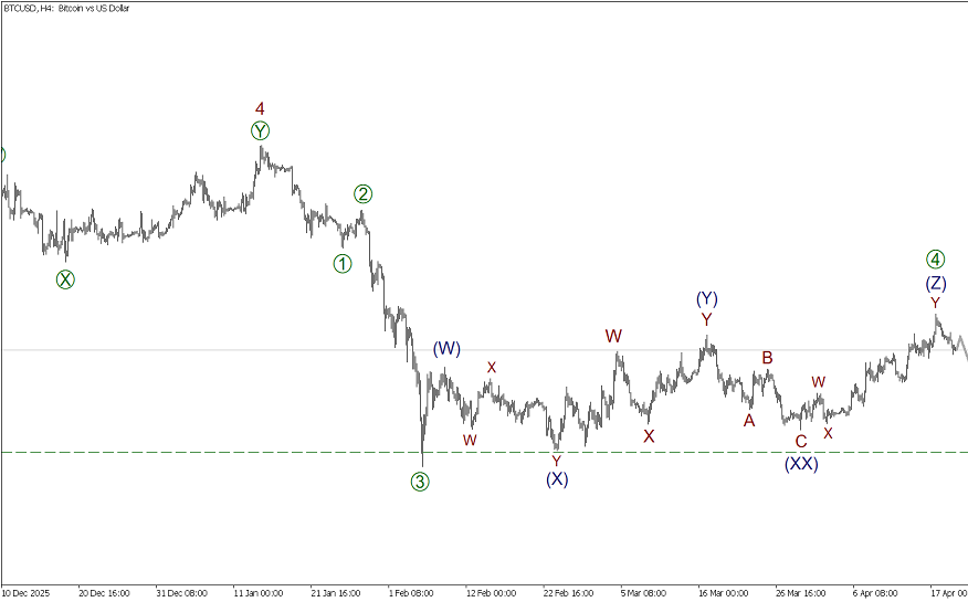 Предположительно, в долгосрочной перспективе по Биткоину строится начальная часть медвежьего зигзага. В стадии развития первая волна (A), в ее составе завершены подволны [1]-[2]-[3]-[4]. Сложная коррекция [4] приняла форму тройного зигзага (W)-(X)-(Y)-(XX)-(Z). В процессе построения подволна [5], она может стать импульсом (1)-(2)-(3)-(4)-(5) и завершиться около уровня 62400.16. Данный минимум ранее отметила подволна (X).