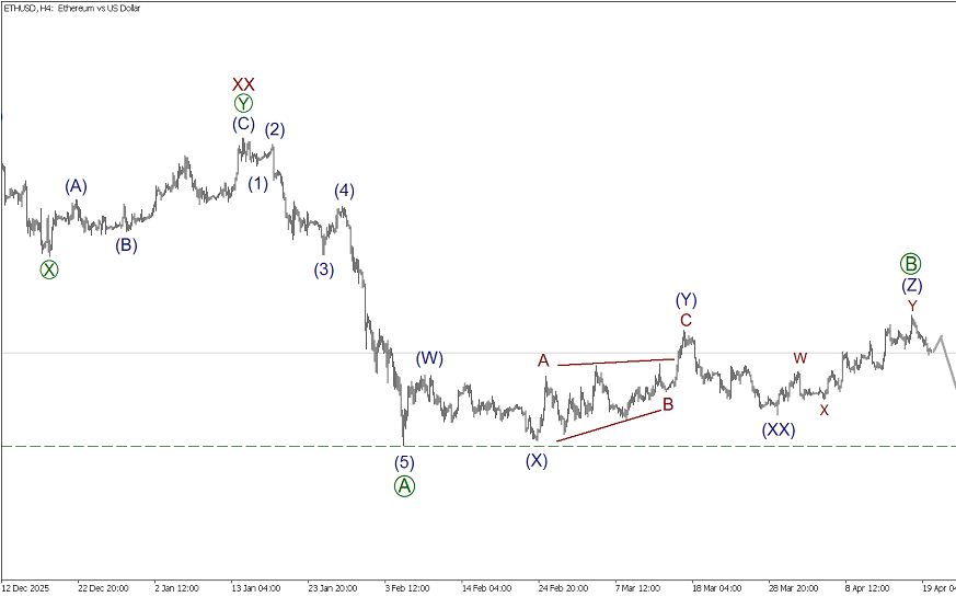 По ETHUSD, предположительно, формируется крупный восходящий зигзаг (A)-(B)-(C). В его составе завершена первая импульсная волна (A), сейчас формируется сложная коррекция (B), похожая на тройной зигзаг W-X-Y-XX-Z. Последняя действующая волна Z of (B) может завершиться в виде зигзага [A]-[B]-[C], для его полной комплектации необходима подволна [C]. Скорее всего, цена снизится в импульсе [C] к минимуму 1769.45. На данном уровне ранее завершился импульс [A].