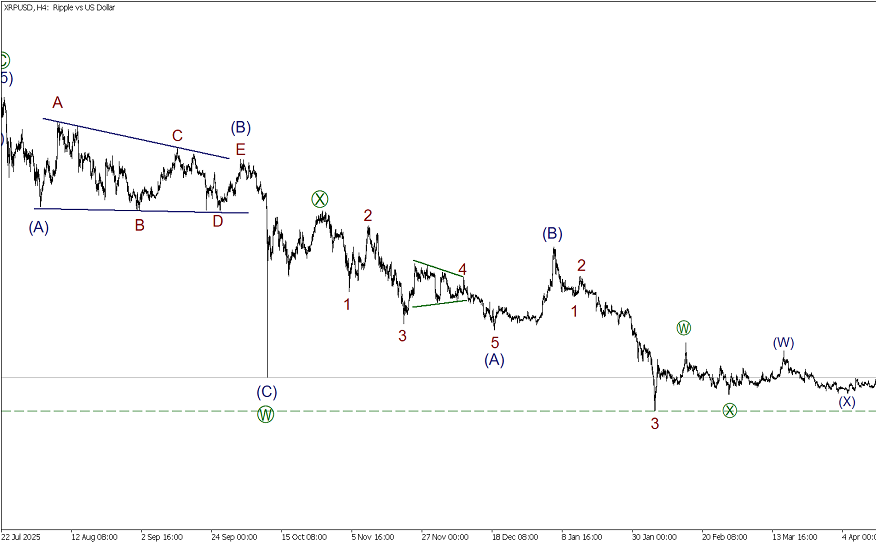 По XRPUSD в среднесрочной перспективе формируется крупная продолжительная коррекция (4) в виде двойного зигзага W-X-Y. Сейчас строится финальная волна Y в виде двойного зигзага [W]-[X]-[Y]. Внутри волны [Y] в настоящее время строится медвежья импульсная волна (C). Предполагается, что цена корректируется в рамках сложной волны 4, в ближайшее время она завершится и начнется снижение в импульсе 5. Можно рассматривать короткие позиции с целью на минимуме 1.135.