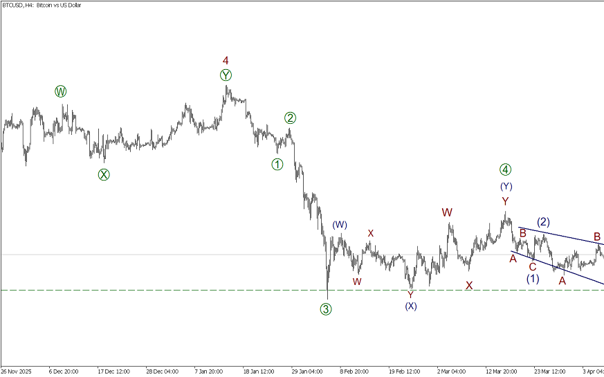 По Биткоину на графике H4 формируется начальная часть медвежьего зигзага. В стадии развития первая подволна (A). В ее составе завершены подволны [1]-[2]-[3]-[4]. В стадии развития подволна [5], она может принять форму конечного диагональника и завершиться на отметке 62315.10. Это предыдущий минимум, который отметила подволна (X).