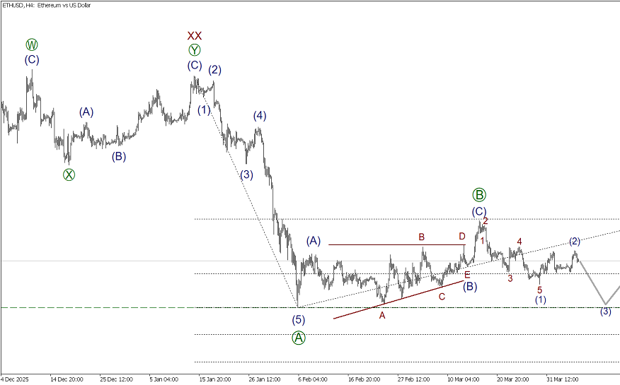 В глобальной перспективе по ETHUSD формируется крупный восходящий зигзаг (A)-(B)-(C). На сегодняшний день завершена первая импульсная волна (A), сейчас формируется сложная коррекция (B), которая может стать тройным зигзагом. Последняя действующая волна Z of (B) может завершиться в виде зигзага [A]-[B]-[C], для его полной комплектации необходима подволна [C]. Скорее всего, цена снизится в импульсе [C] к уровню 1769.45. На указанном уровне величина волны [C] составит 38.2% от волны [A].