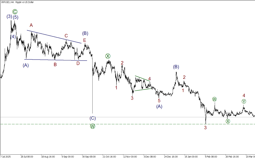 По XRPUSD в среднесрочной перспективе формируется крупная сложная коррекция (4), она принимает форму двойного зигзага W-X-Y. Сейчас строится финальная волна Y. Предполагается, что в ближайшее время цена снизится в рамках подволны 5 к предыдущему минимуму 1.134. Данный уровень ранее отметила подволна 3.