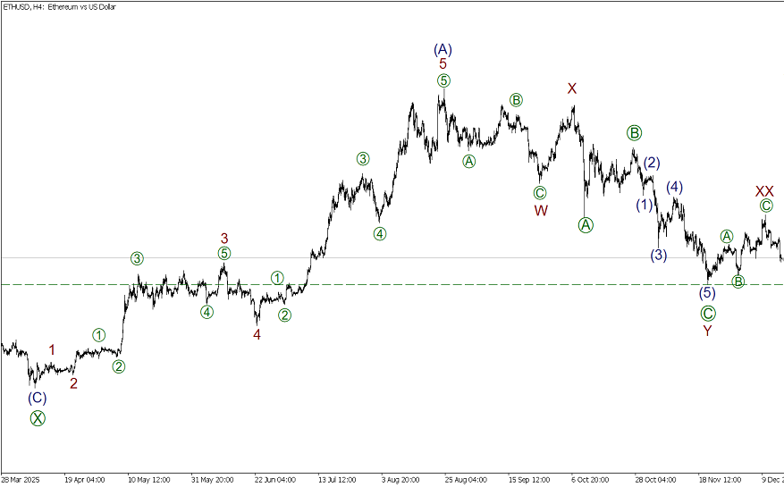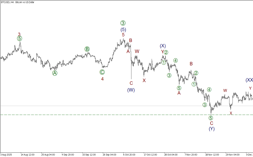 По Биткоину на графике H4 формируется вторая половина бычьего импульса [1]-[2]-[3]-[4]-[5]. Завершена импульсная волна [3], сейчас цена снижается в коррекции [4], которая может стать тройным зигзагом (W)-(X)-(Y)-(XX)-(Z). Недавно завершились волна (Y) и волна-связка (XX) в виде двойного зигзага W-X-Y. На последнем участке графика строится первая часть волны (Z). Вполне возможно, что цена упадет к минимуму 80842.00, который отметила подволна (Y).