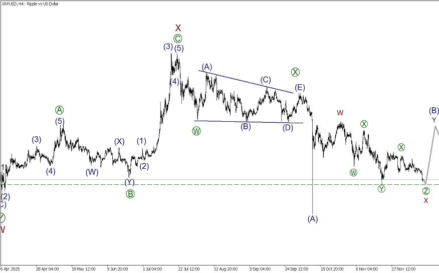 По XRPUSD в глобальной перспективе формируется бычий импульс (1)-(2)-(3)-(4)-(5). На текущем графике представлена коррекционная волна (4), она принимает форму двойного зигзага W-X-Y. В процессе развития действующая волна Y, она тоже похожа на двойной зигзаг [W]-[X]-[Y]. Внутри заключительной действующей волны [Y] завершена первая импульсная волна (A), сейчас формируется боковая коррекция (B), которая может стать двойным зигзагом W-X-Y.  Волна-связка X, по всей видимости, принимает форму тройного зигзага [W]-[X]-[Y]-[X]-[Z]. Волна-связка [X] уже построена, цена снижается в действующей волне [Z]. Предполагается, что котировки могут упасть к минимуму 1.807. Данный уровень ранее отметила подволна [Y].