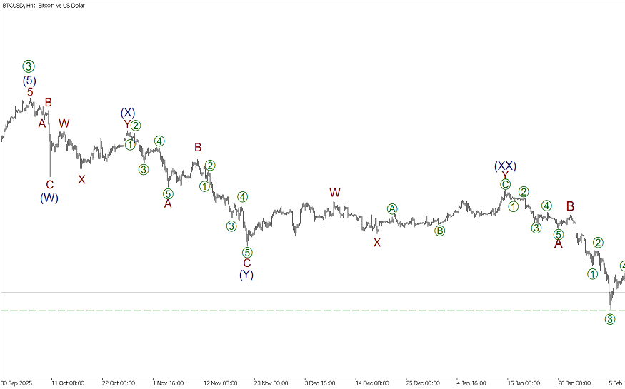 Предполагается, что по Биткоину формируется вторая половина бычьего импульса [1]-[2]-[3]-[4]-[5]. На четырехчасовом таймфрейме завершена импульсная волна [3], сейчас цена падает в рамках коррекции [4], которая может стать тройным зигзагом (W)-(X)-(Y)-(XX)-(Z). Сформированы волна (Y) и волна-связка (XX) в виде двойного зигзага W-X-Y. Ожидается, что цена снизится в зигзагообразной волне (Z), состоящей из подволн A-B-C, к уровню 60736.28. Для завершения волны C необходима импульсная подволна [5].